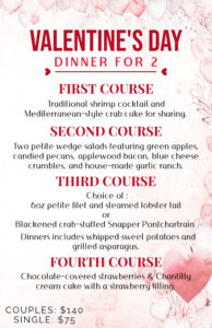 We are celebrating Valentine’s Day all weekend at the Resort. Join us for a special dinner for 2 on Friday, February 13th or Saturday, February 14th. Make your reservations today by emailing info@rayburnresorts.com or calling 409-698-1013.